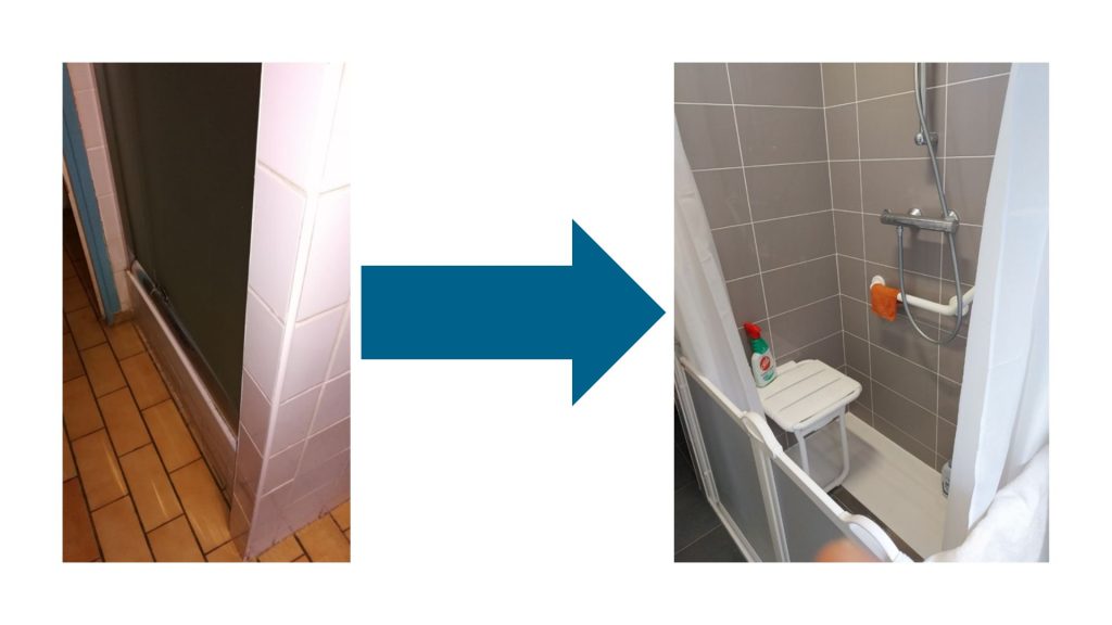 PROJET DE TRAVAUX : Projet d’adaptation d’un logement d’un propriétaire occupant aux revenus modestes. Il s’agit d’un couple de propriétaire en perte d’autonomie. La marche de la douche devenant trop haute pour les propriétaires, ils l’ont remplacé par une douche PMR.